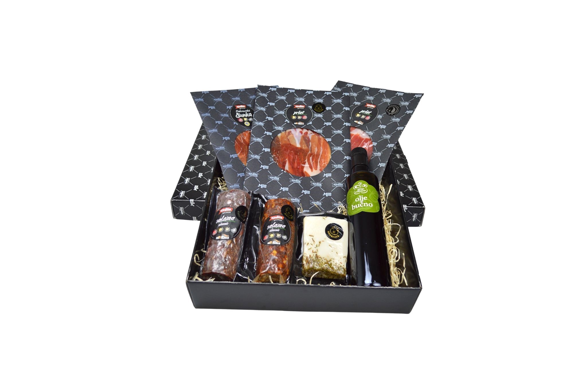 PREKMURSKA ŠUNKA NAREZEK 120g, PRŠUT SELECTION NAREZEK 120g, MANGALICA PRŠUT NAREZEK 120g, SALAMA MANGALICA cca 340g, SALAMA Z BUČNIMI SEMENI cca 300g, MANGALICA LARDO Z ROŽMARINOM cca 190g, BUČNO OLJE 0,5l, DARILNA ŠKATLA S POLNILOM