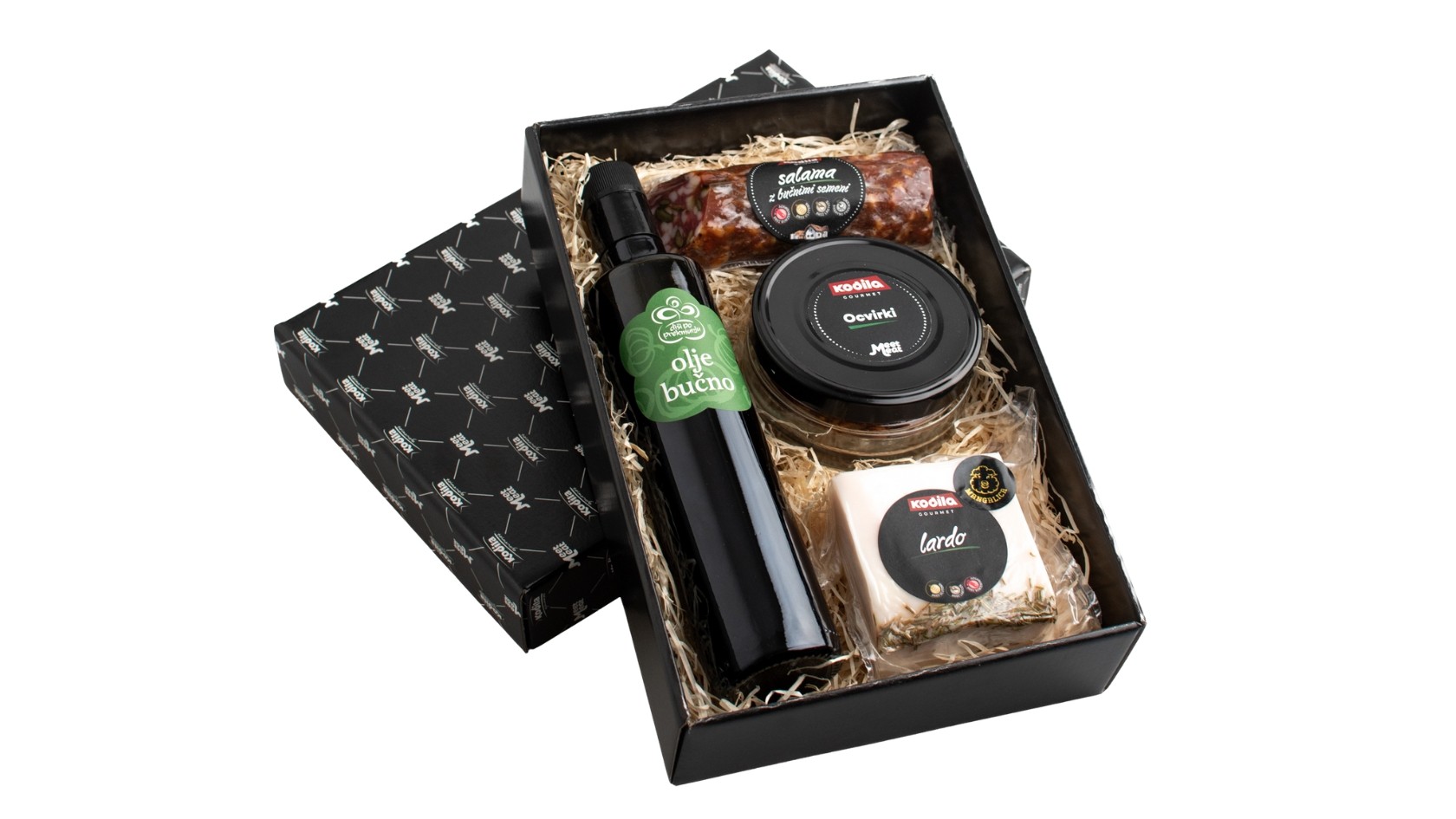 BUČNO OLJE 0,5L, SALAMA Z BUČNIMI SEMENI CCA 300G, MANGALICA LARDO Z ROŽMARINOM CCA 190G, OCVIRKI PREMIUM V STEKLENEM KOZARCU 140G, DARILNA ŠKATLA Z POLNILOM