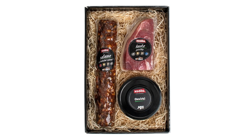 SALAMA Z BUČNIMI SEMENI CELA CCA 600G, GORIČKA ŠUNKA KOS CCA 700G, OCVIRKI PREMIUM V STEKLENEM KOZARCU 140G, DARILNA ŠKATLA Z POLNILOM