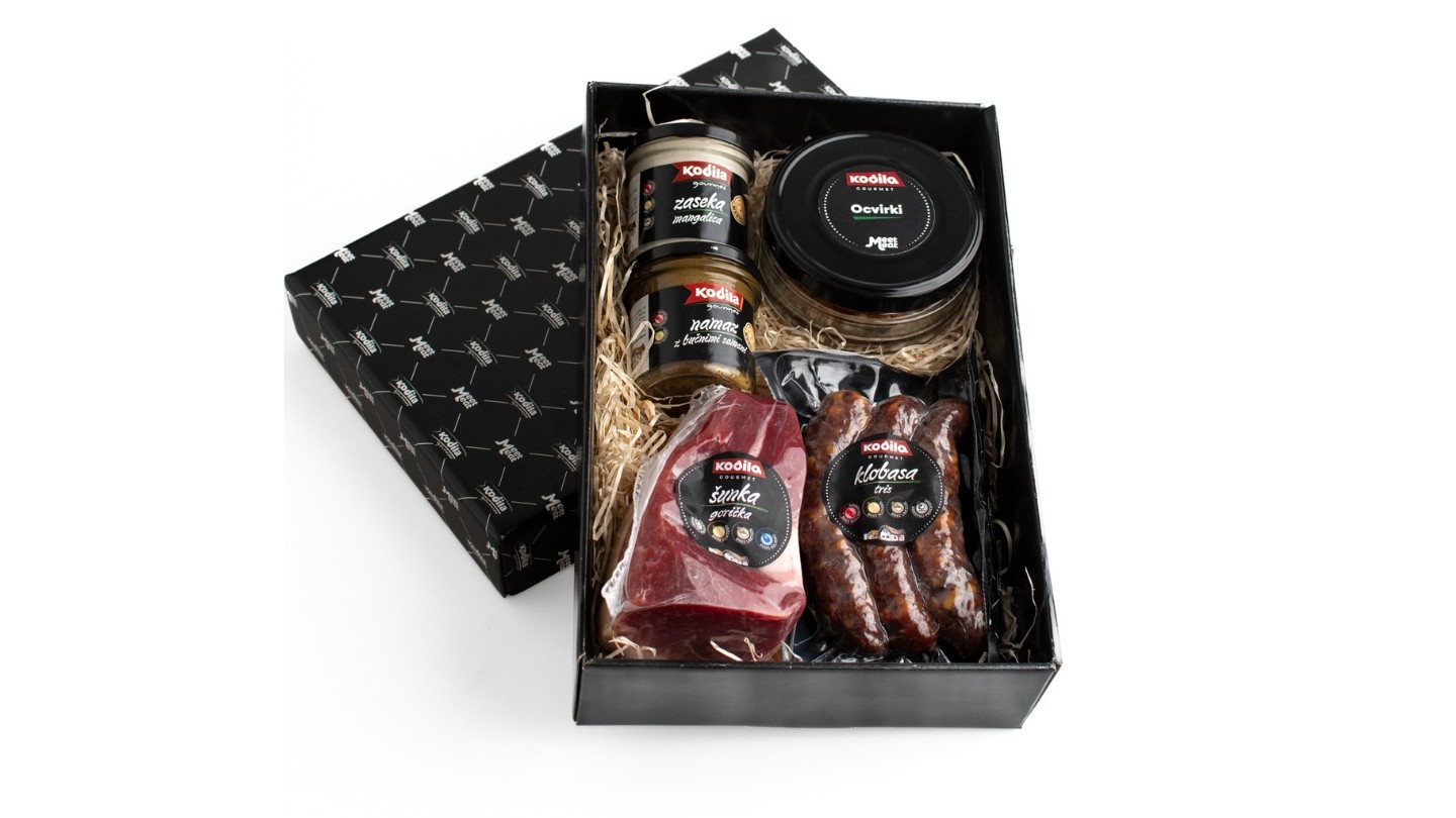 GORIČKA ŠUNKA KOS CCA 700G, KLOBASA SUŠENA TRIS CCA 300G, MANGALICA ZASEKA 150G, MANGALICA NAMAZ Z BUČNIMI SEMENI 150G, OCVIRKI PREMIUM V STEKLENEM KOZARCU 140G, DARILNA ŠKATLA Z POLNILOM